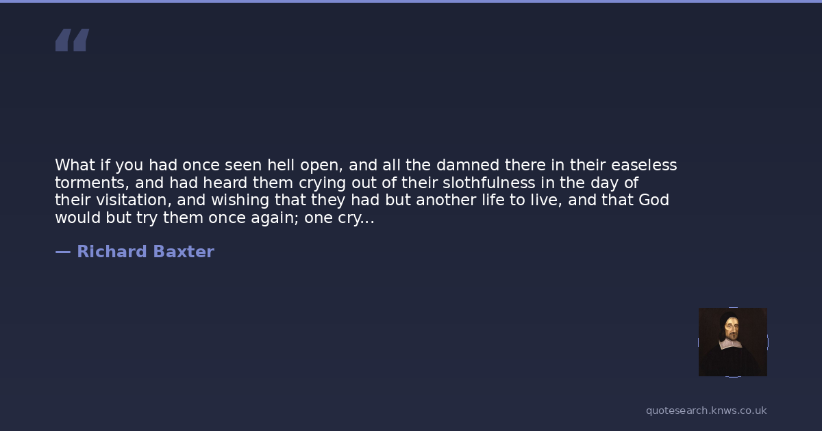 What if you had once seen hell open, and all the damned there in their easeless torments, and had heard them crying out of their slothfulness in the day of their visitation, and wishing that they had but another life to live, and that God would but try them once again; one crying out of this neglect of duty, and another of his loitering and trifling, when he should have been labouring for his life; what manner of person would you have been after such a sight as this ? (284)