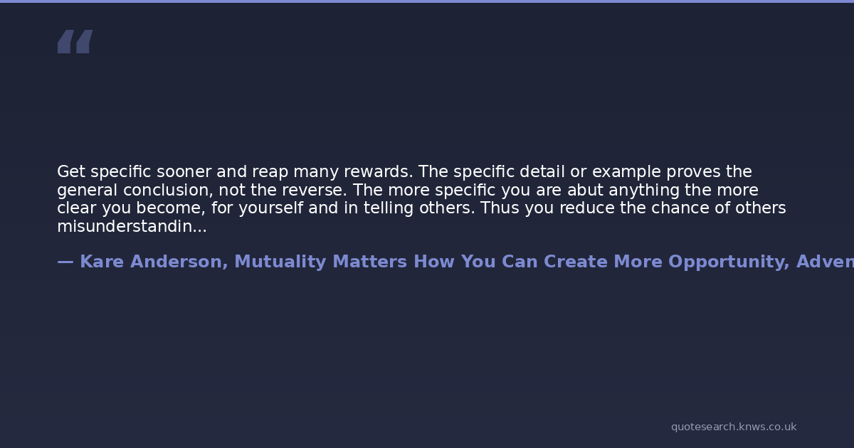 Get specific sooner and reap many rewards. The specific detail or example proves the general conclusion, not the reverse. The more specific you are abut anything the more clear you become, for yourself and in telling others. Thus you reduce the chance of others misunderstanding you. And you become more compelling, credible and memorable.