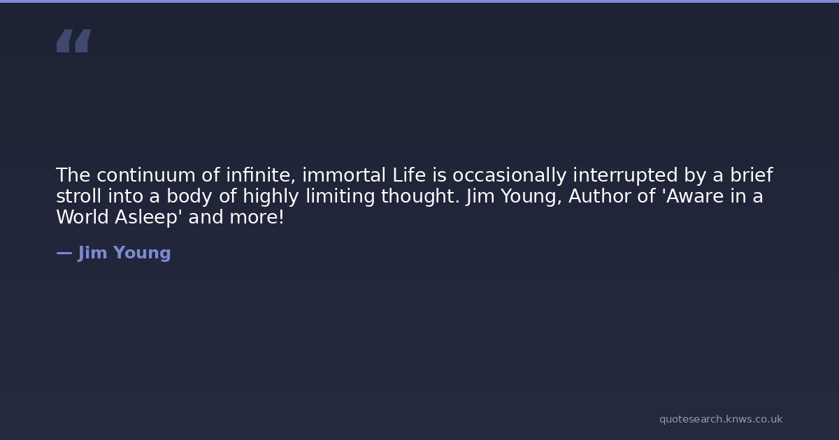The continuum of infinite, immortal Life is occasionally interrupted by a brief stroll into a body of highly limiting thought. Jim Young, Author of 'Aware in a World Asleep' and more!