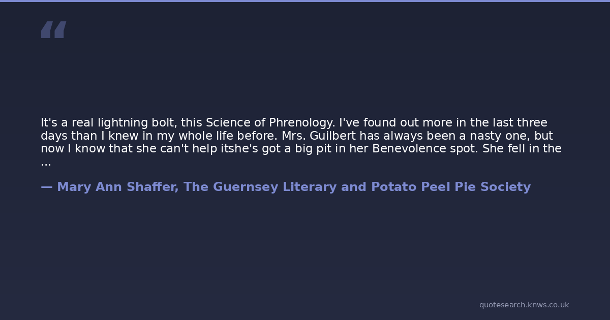 It's a real lightning bolt, this Science of Phrenology. I've found out more in the last three days than I knew in my whole life before. Mrs. Guilbert has always been a nasty one, but now I know that she can't help itshe's got a big pit in her Benevolence spot. She fell in the quarry when she was a girl, and my guess is she cracked her Benevolence and was never the same since.