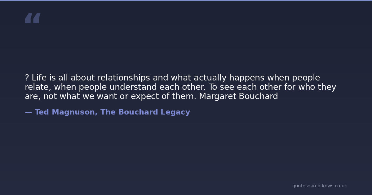? Life is all about relationships and what actually happens when people relate, when people understand each other. To see each other for who they are, not what we want or expect of them. Margaret Bouchard