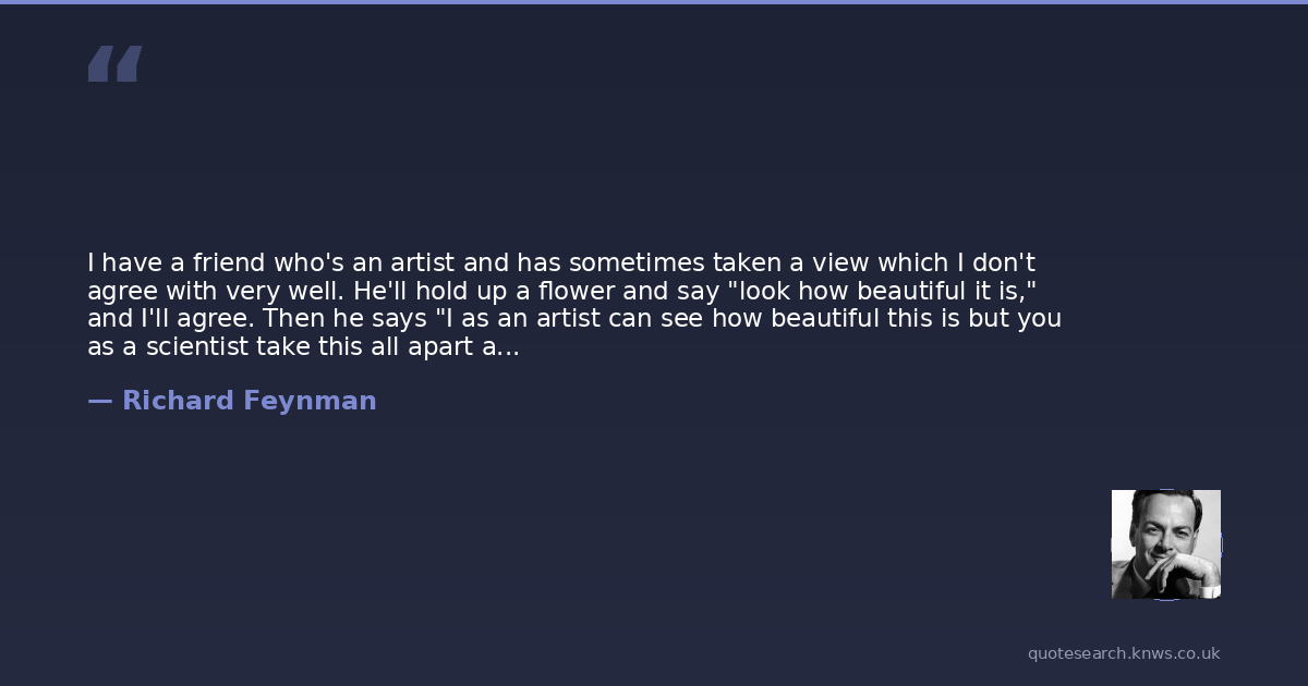I have a friend who's an artist and has sometimes taken a view which I don't agree with very well. He'll hold up a flower and say "look how beautiful it is," and I'll agree. Then he says "I as an artist can see how beautiful this is but you as a scientist take this all apart and it becomes a dull thing," and I think that he's kind of nutty. First of all, the beauty that he sees is available to other people and to me too, I believe. Although I may not be quite as refined aesthetically as he is ... I can appreciate the beauty of a flower. At the same time, I see much more about the flower than he sees. I could imagine the cells in there, the complicated actions inside, which also have a beauty. I mean it's not just beauty at this dimension, at one centimeter; there's also beauty at smaller dimensions, the inner structure, also the processes. The fact that the colors in the flower evolved in order to attract insects to pollinate it is interesting; it means that insects can see the color. It adds a question: does this aesthetic sense also exist in the lower forms? Why is it aesthetic? All kinds of interesting questions which the science knowledge only adds to the excitement, the mystery and the awe of a flower. It only adds. I don't understand how it subtracts.