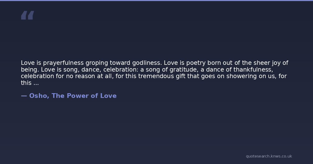 Love is prayerfulness groping toward godliness. Love is poetry born out of the sheer joy of being. Love is song, dance, celebration: a song of gratitude, a dance of thankfulness, celebration for no reason at all, for this tremendous gift that goes on showering on us, for this whole universe, from the dust to the divine.