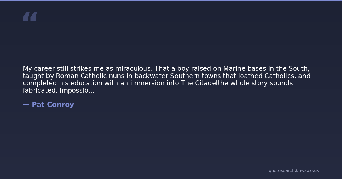 My career still strikes me as miraculous. That a boy raised on Marine bases in the South, taught by Roman Catholic nuns in backwater Southern towns that loathed Catholics, and completed his education with an immersion into The Citadelthe whole story sounds fabricated, impossible even to me. Maybe especially to me.