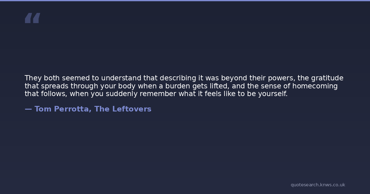 They both seemed to understand that describing it was beyond their powers, the gratitude that spreads through your body when a burden gets lifted, and the sense of homecoming that follows, when you suddenly remember what it feels like to be yourself.