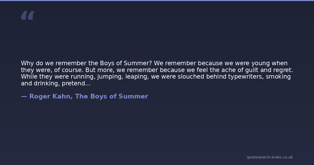 Why do we remember the Boys of Summer? We remember because we were young when they were, of course. But more, we remember because we feel the ache of guilt and regret. While they were running, jumping, leaping, we were slouched behind typewriters, smoking and drinking, pretending to some mystic communion with men we didn't really know or like. Men from ghettos we didn't dare visit, or rural farms we passed at sixty miles an hour. Loving what they did on the field, we could forget how superior we felt towards them the rest of the time. By cheering them on we proved we had nothing to do with the injustices that kept their lives separate from ours. There's nothing sordid or false about the Boys of Summer. Only our memories smell like sweaty jockstraps.