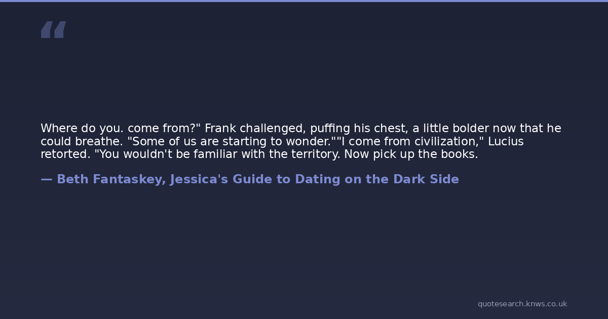 Where do you. come from?" Frank challenged, puffing his chest, a little bolder now that he could breathe. "Some of us are starting to wonder.""I come from civilization," Lucius retorted. "You wouldn't be familiar with the territory. Now pick up the books.