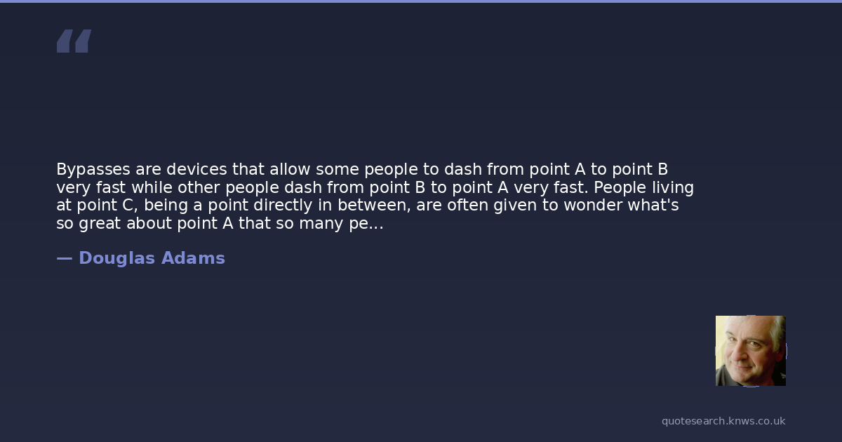 Bypasses are devices that allow some people to dash from point A to point B very fast while other people dash from point B to point A very fast. People living at point C, being a point directly in between, are often given to wonder what's so great about point A that so many people from point B are so keen to get there, and what's so great about point B that so many people from point A are so keen to get there. They often wish that people would just once and for all work out where the hell they wanted to be.