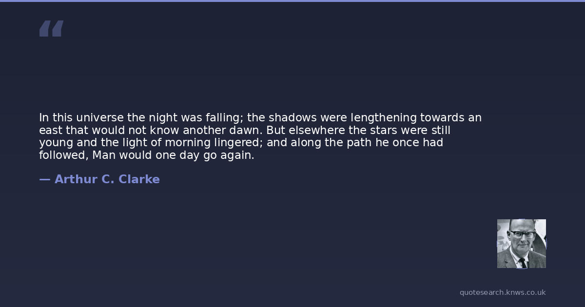 In this universe the night was falling; the shadows were lengthening towards an east that would not know another dawn. But elsewhere the stars were still young and the light of morning lingered; and along the path he once had followed, Man would one day go again.