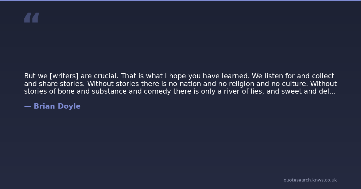But we [writers] are crucial. That is what I hope you have learned. We listen for and collect and share stories. Without stories there is no nation and no religion and no culture. Without stories of bone and substance and comedy there is only a river of lies, and sweet and delicious ones they are, too. We are the gatherers, the shepherds, the farmers of stories. We wander widely and look for them and gather them and harvest them and share them as food. It is a craft as necessary and nutritious as any other, and if you are going to be good at it you must double your humility and triple your curiosity and quadruple your ability to listen.