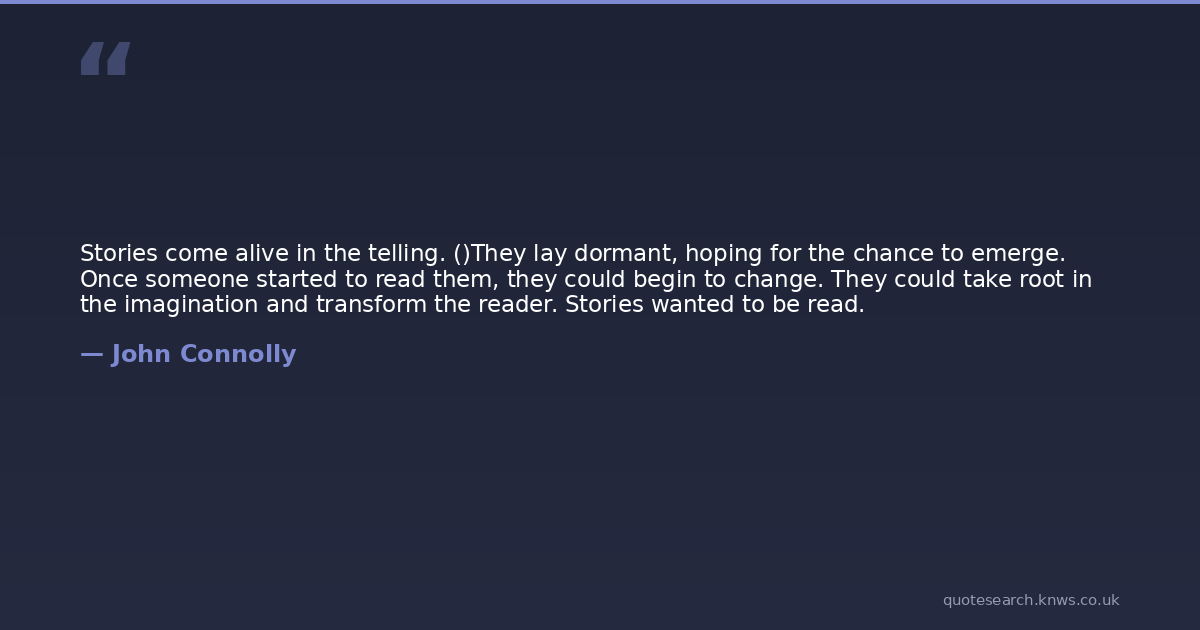 Stories come alive in the telling. ()They lay dormant, hoping for the chance to emerge. Once someone started to read them, they could begin to change. They could take root in the imagination and transform the reader. Stories wanted to be read.