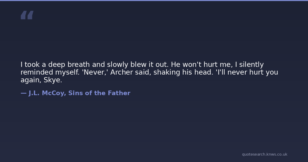I took a deep breath and slowly blew it out. He won't hurt me, I silently reminded myself. 'Never,' Archer said, shaking his head. 'I'll never hurt you again, Skye.