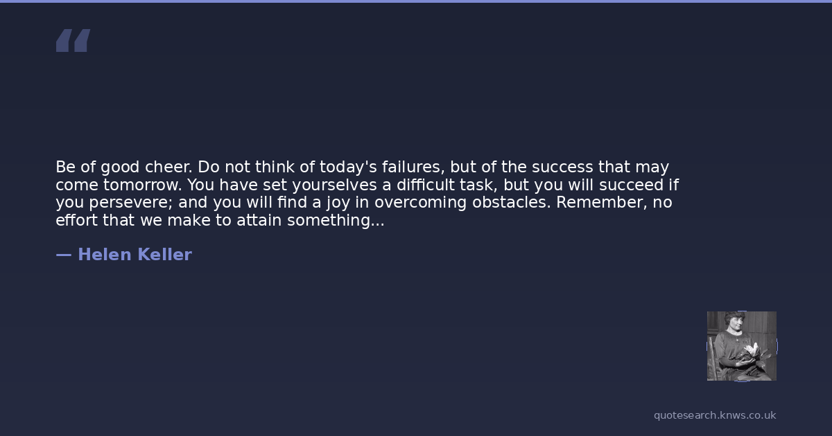 Be of good cheer. Do not think of today's failures, but of the success that may come tomorrow. You have set yourselves a difficult task, but you will succeed if you persevere; and you will find a joy in overcoming obstacles. Remember, no effort that we make to attain something beautiful is ever lost.