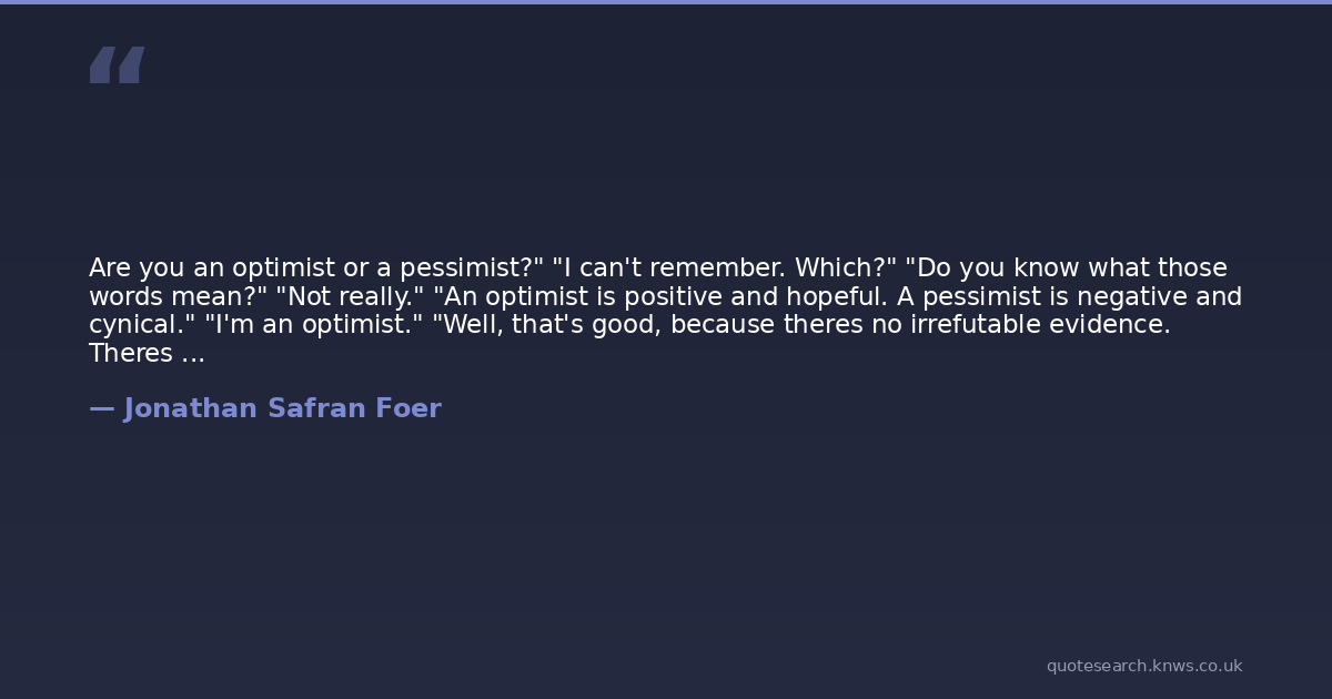 Are you an optimist or a pessimist?" "I can't remember. Which?" "Do you know what those words mean?" "Not really." "An optimist is positive and hopeful. A pessimist is negative and cynical." "I'm an optimist." "Well, that's good, because theres no irrefutable evidence. Theres nothing that could convince someone who doesnt want to be convinced. But there is an abundance of clues that would give the wanting believer something to hold on to.