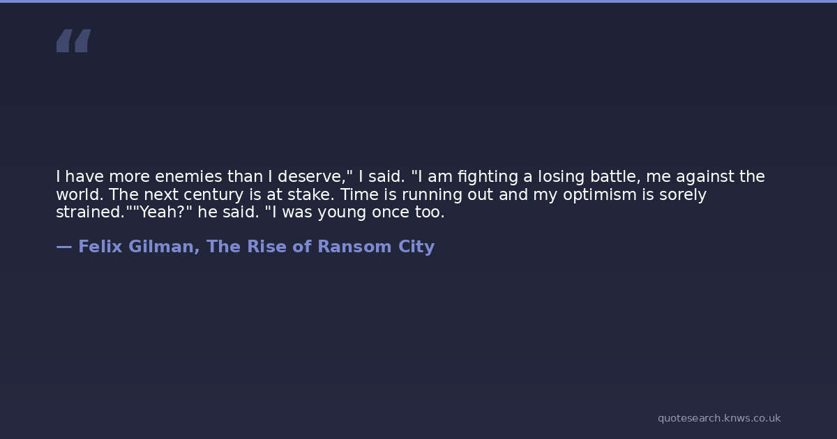 I have more enemies than I deserve," I said. "I am fighting a losing battle, me against the world. The next century is at stake. Time is running out and my optimism is sorely strained.""Yeah?" he said. "I was young once too.