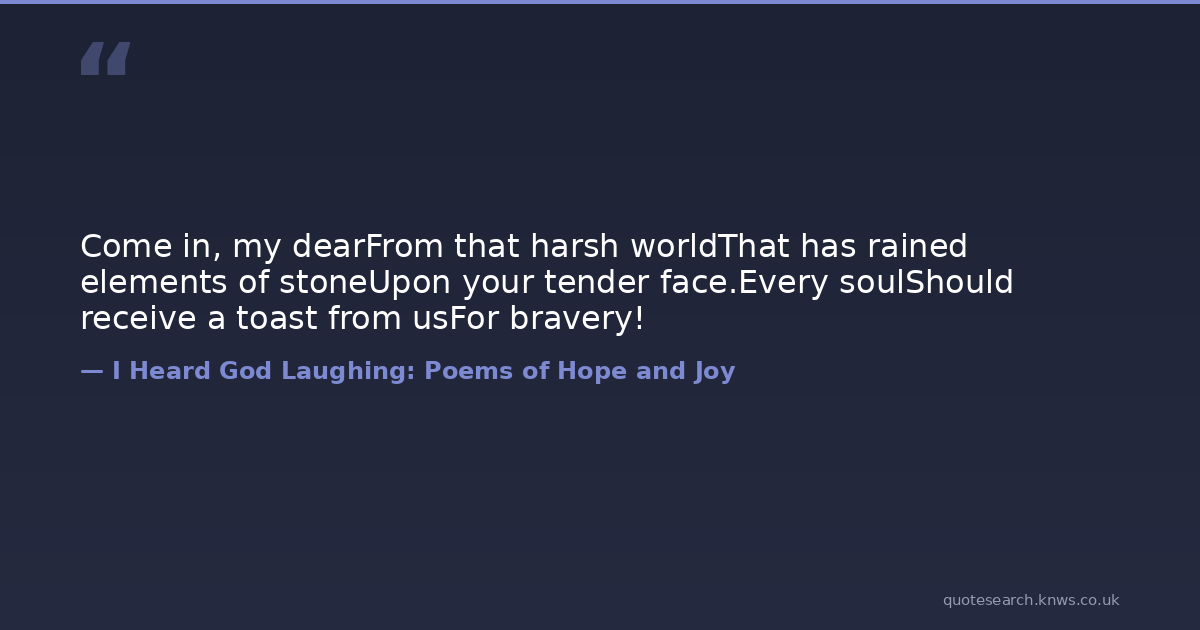 Come in, my dearFrom that harsh worldThat has rained elements of stoneUpon your tender face.Every soulShould receive a toast from usFor bravery!