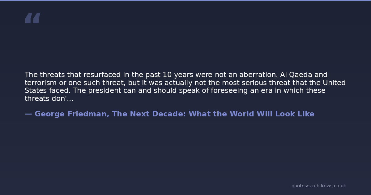 The threats that resurfaced in the past 10 years were not an aberration. Al Qaeda and terrorism or one such threat, but it was actually not the most serious threat that the United States faced. The president can and should speak of foreseeing an era in which these threats don't exist, but you must not believe his own rhetoric. To the contrary, he must gradually ease the country away from the idea that threats to imperial power will ever subside, then l lead it to an understanding that these threats are the price Americans pay for the wealth and power they hold.