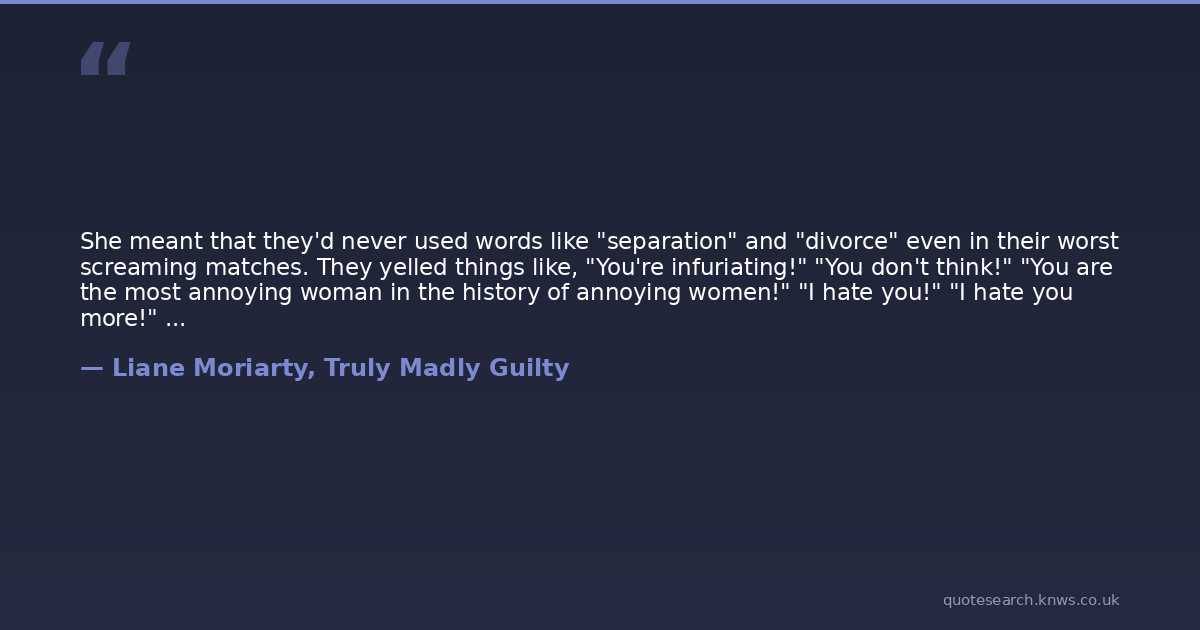 She meant that they'd never used words like "separation" and "divorce" even in their worst screaming matches. They yelled things like, "You're infuriating!" "You don't think!" "You are the most annoying woman in the history of annoying women!" "I hate you!" "I hate you more!" and they always, always used the word "always," even though Clementine's mother had said you should never use that word in an argument with your spouse, as in, for example, "You always forget to refill the water jug!" (But Sam did always forget. It was accurate.)