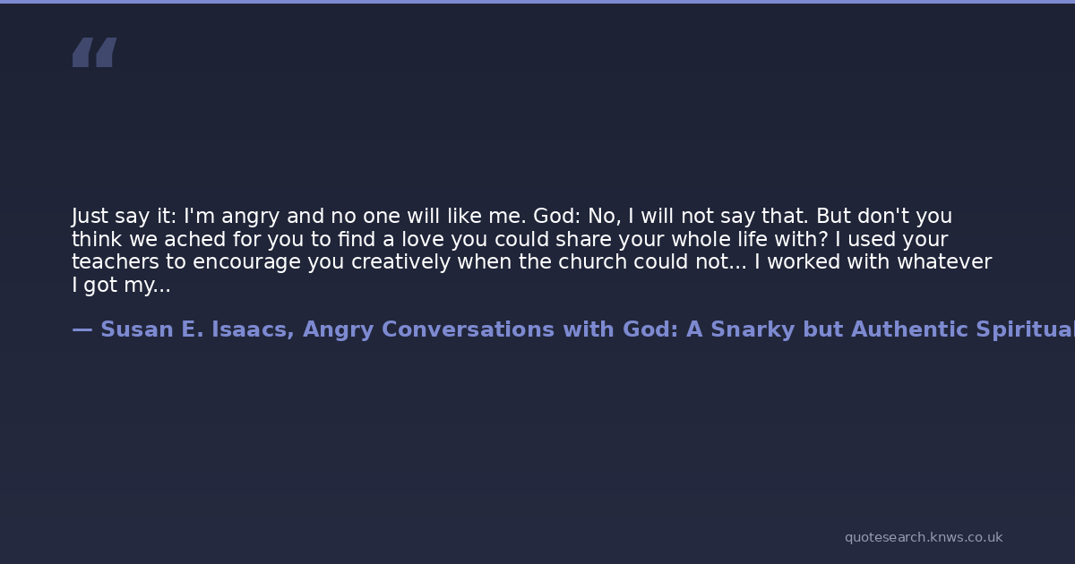 Just say it: I'm angry and no one will like me. God: No, I will not say that. But don't you think we ached for you to find a love you could share your whole life with? I used your teachers to encourage you creatively when the church could not... I worked with whatever I got my hands on. Can you see that?