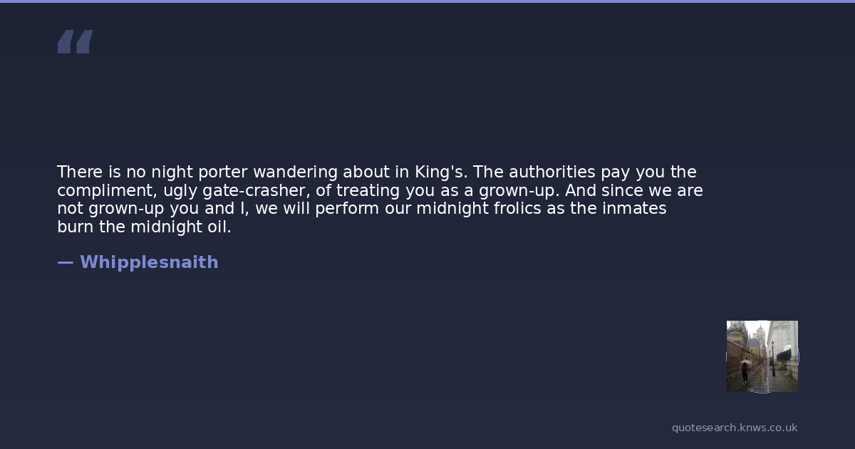 There is no night porter wandering about in King's. The authorities pay you the compliment, ugly gate-crasher, of treating you as a grown-up. And since we are not grown-up you and I, we will perform our midnight frolics as the inmates burn the midnight oil.