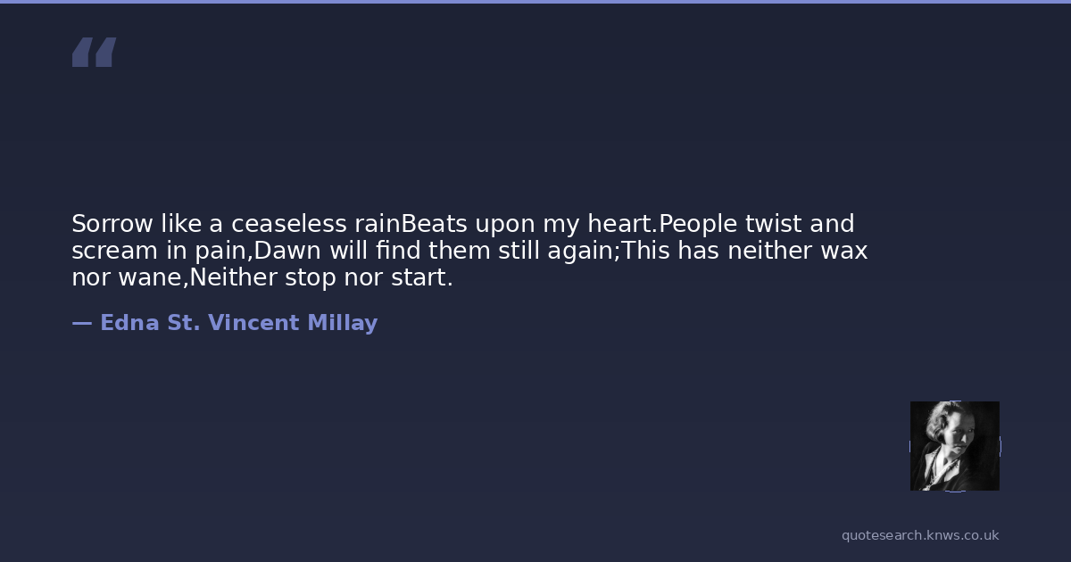 Sorrow like a ceaseless rainBeats upon my heart.People twist and scream in pain,Dawn will find them still again;This has neither wax nor wane,Neither stop nor start.