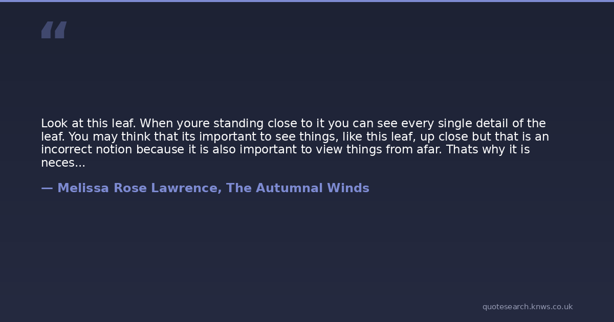 Look at this leaf. When youre standing close to it you can see every single detail of the leaf. You may think that its important to see things, like this leaf, up close but that is an incorrect notion because it is also important to view things from afar. Thats why it is necessary to look at all perspectives of an issue or of an object. --The Unnamed Samurai (Chapter 5)