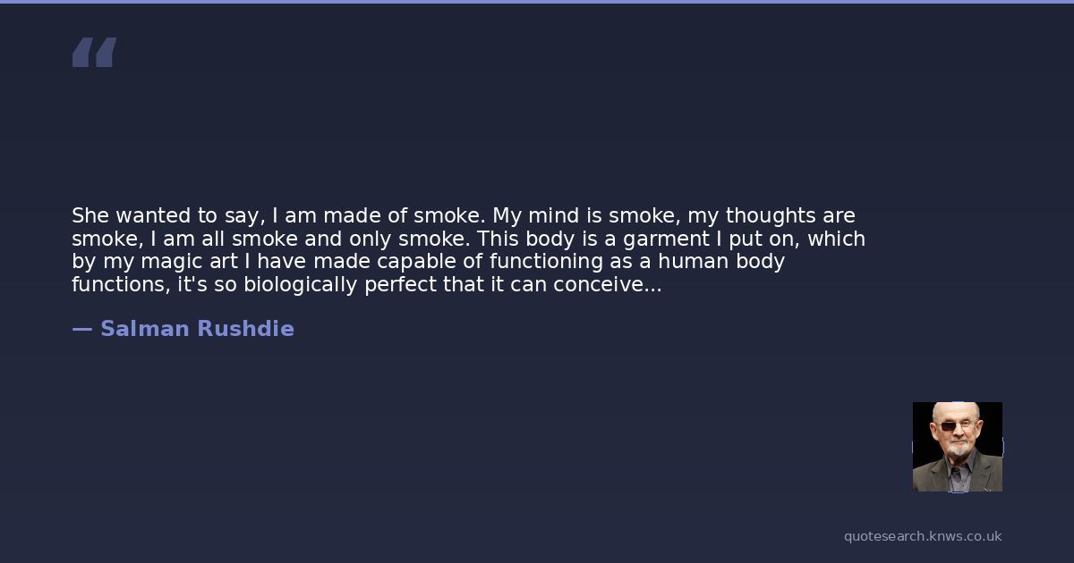 She wanted to say, I am made of smoke. My mind is smoke, my thoughts are smoke, I am all smoke and only smoke. This body is a garment I put on, which by my magic art I have made capable of functioning as a human body functions, it's so biologically perfect that it can conceive children and pop them out in threes, fours and fives. Yet I am not of this body and could, if I chose, inhabit another woman, or an antelope, or a gnat. Aristotle was wrong, for I have lived for aeons, and altered by body when I chose, like a garment of which I had grown tired. The mind and the body are two, she wanted to say, but she knew it would disappoint him to be disagreed with, so she held her tongue.