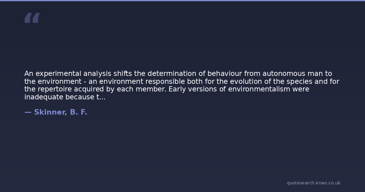 An experimental analysis shifts the determination of behaviour from autonomous man to the environment - an environment responsible both for the evolution of the species and for the repertoire acquired by each member. Early versions of environmentalism were inadequate because they could not explain how the environment worked, and much seemed to be left for autonomous man to do. But environmental contingencies now take over functions once attributed to autonomous man, and certain questions arise. Is man then 'abolished'? Certainly not as a species or as an individual achiever. It is the autonomous inner man who is abolished, and that is a step forward. But does man not then become merely a victim or passive observer of what is happening to him? He is indeed controlled by his environment, but we must remember that it is an environment largely of his own making. The evolution of a culture is a gigantic exercise in self-control. It is often said that a scientific view of man leads to wounded vanity, a sense of hopelessness, and nostalgia. But no theory changes what it is a theory about; man remains what he has always been. And a new theory may change what can be done with its subject matter. A scientific view of man offers exciting possibilities. We have not yet seen what man can make of man.