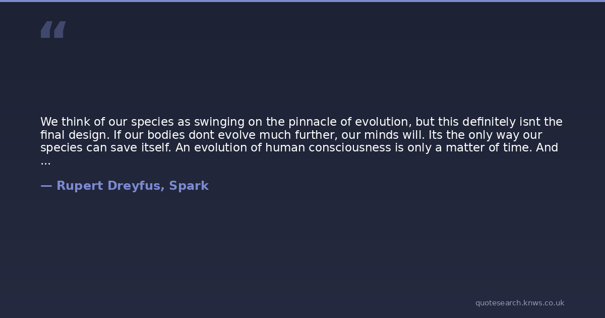 We think of our species as swinging on the pinnacle of evolution, but this definitely isnt the final design. If our bodies dont evolve much further, our minds will. Its the only way our species can save itself. An evolution of human consciousness is only a matter of time. And thats when we will finally discover the good life, hand in hand. Meanwhile we just have to tough it out and make the most of things.