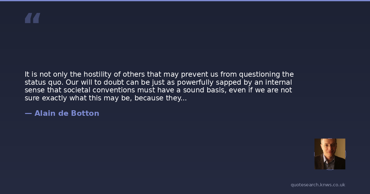 It is not only the hostility of others that may prevent us from questioning the status quo. Our will to doubt can be just as powerfully sapped by an internal sense that societal conventions must have a sound basis, even if we are not sure exactly what this may be, because they have been adhered to by a great many people for a long time. It seems implausible that our society could be gravely mistaken in its beliefs, and at the same time, that we would be alone in noticing the fact. We stifle our doubts, and follow the flock, because we cannot conceive of ourselves as pioneers of hitherto unknown difficult truths. It is for help in overcoming our meekness that we can turn to the philosopher.