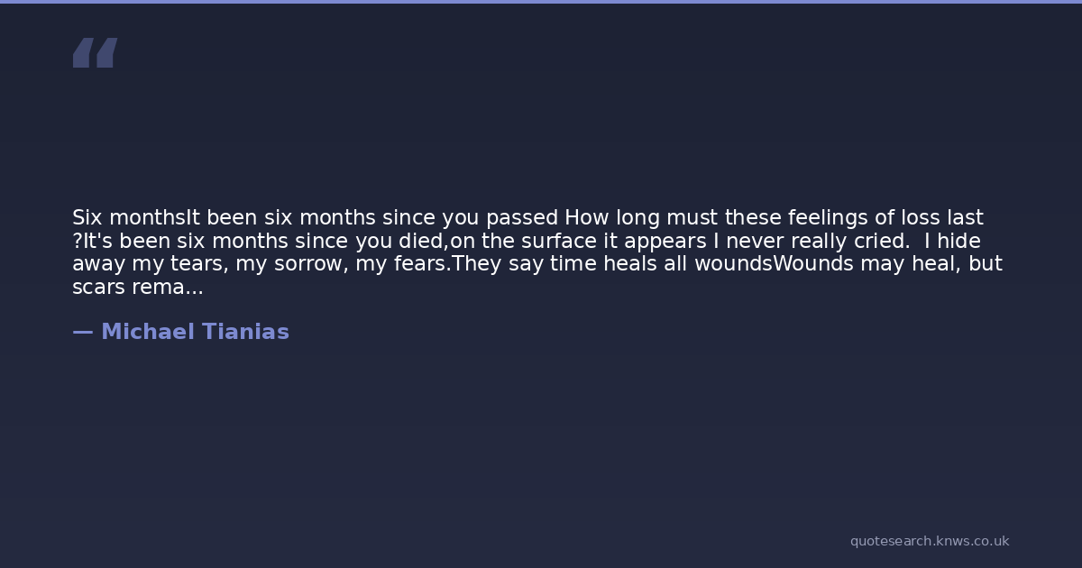 Six monthsIt been six months since you passed How long must these feelings of loss last ?It's been six months since you died,on the surface it appears I never really cried. I hide away my tears, my sorrow, my fears.They say time heals all woundsWounds may heal, but scars remain.No one really sees the pain that hides behind my eyes. A heart of gold stopped beatingtwo twinkling eyes closed to restGod broke our hearts that day to prove he only took the best Never a day goes by that youre not in our hearts, our minds and in our souls. We miss you dad.