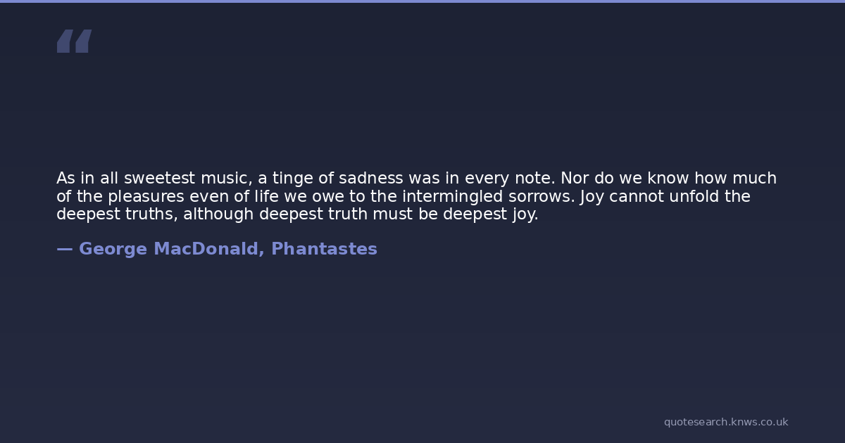 As in all sweetest music, a tinge of sadness was in every note. Nor do we know how much of the pleasures even of life we owe to the intermingled sorrows. Joy cannot unfold the deepest truths, although deepest truth must be deepest joy.