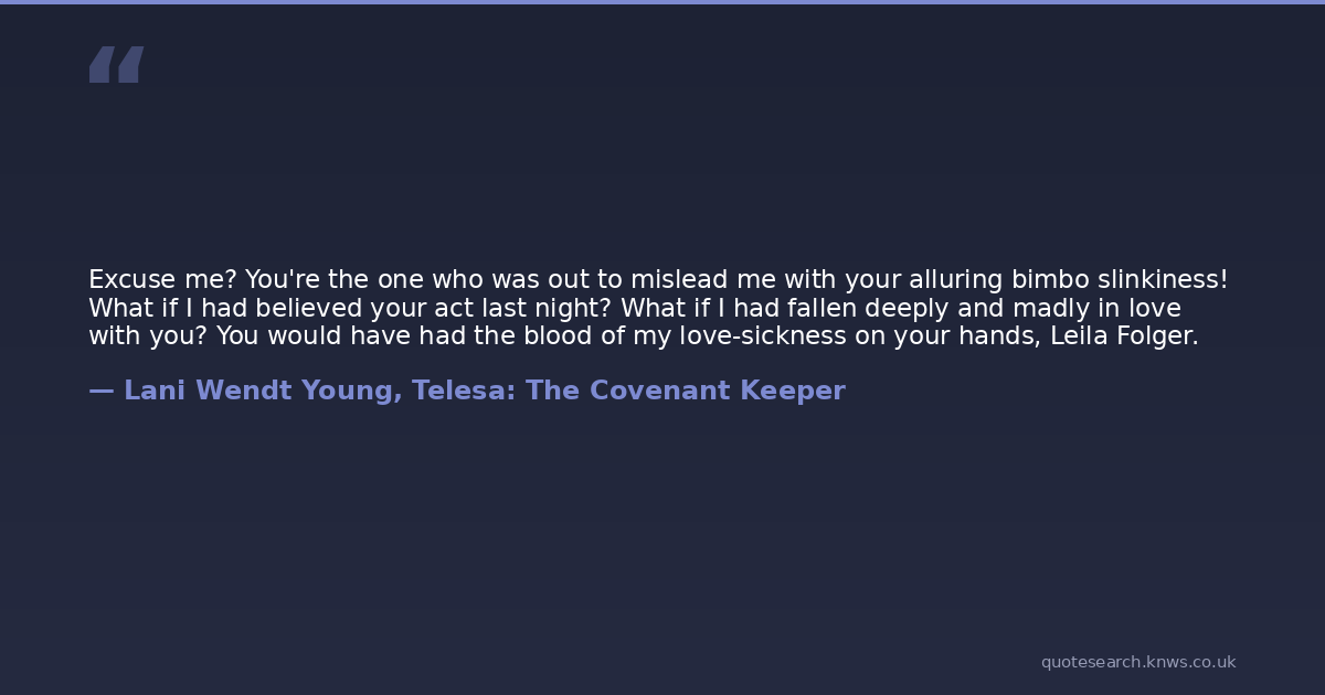 Excuse me? You're the one who was out to mislead me with your alluring bimbo slinkiness! What if I had believed your act last night? What if I had fallen deeply and madly in love with you? You would have had the blood of my love-sickness on your hands, Leila Folger.