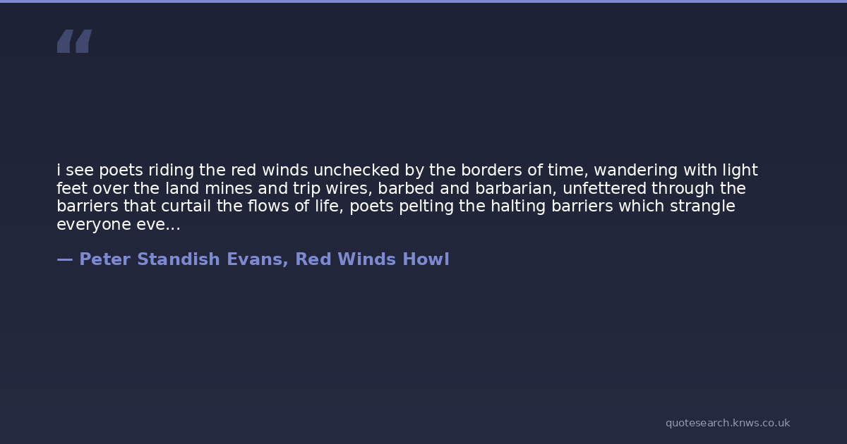 i see poets riding the red winds unchecked by the borders of time, wandering with light feet over the land mines and trip wires, barbed and barbarian, unfettered through the barriers that curtail the flows of life, poets pelting the halting barriers which strangle everyone everywhere.