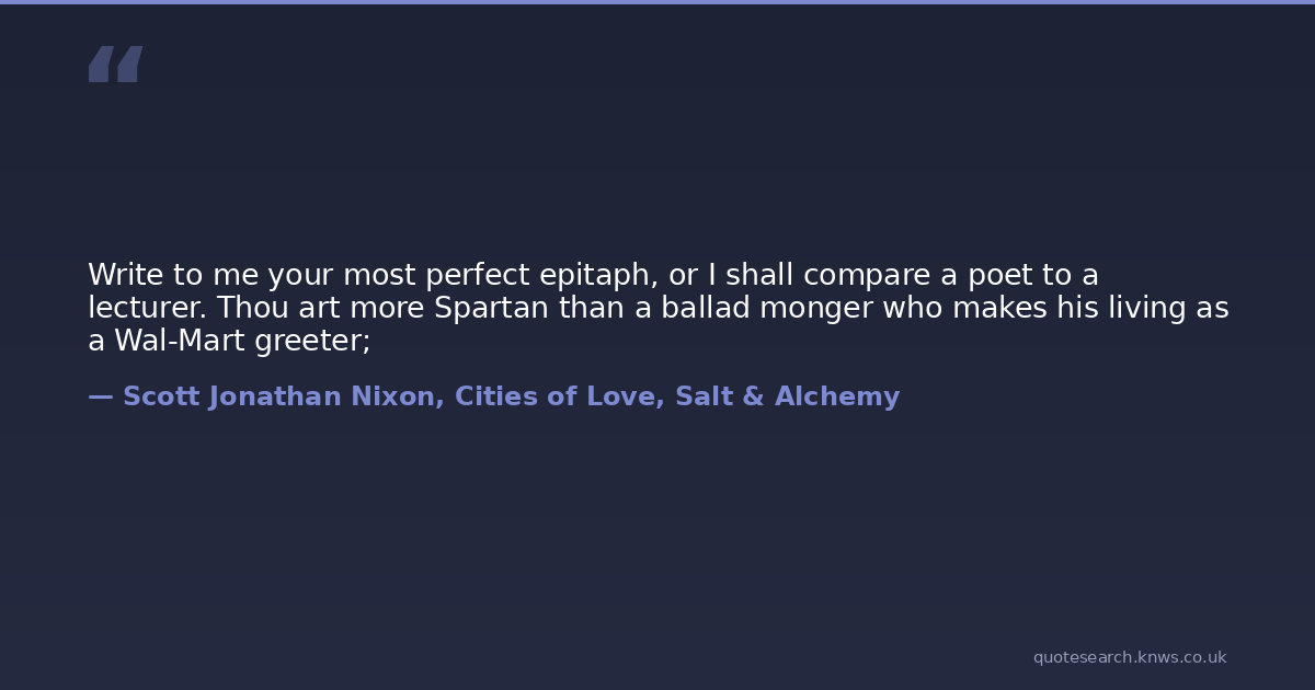 Write to me your most perfect epitaph, or I shall compare a poet to a lecturer. Thou art more Spartan than a ballad monger who makes his living as a Wal-Mart greeter;