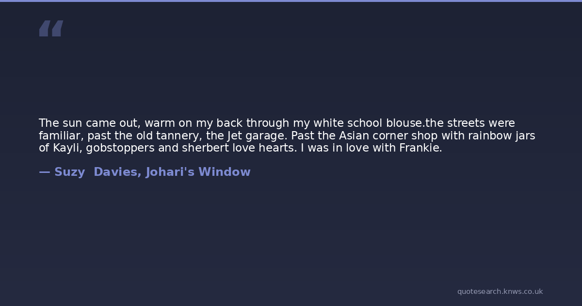 The sun came out, warm on my back through my white school blouse.the streets were familiar, past the old tannery, the Jet garage. Past the Asian corner shop with rainbow jars of Kayli, gobstoppers and sherbert love hearts. I was in love with Frankie.