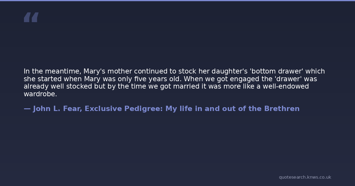 In the meantime, Mary's mother continued to stock her daughter's 'bottom drawer' which she started when Mary was only five years old. When we got engaged the 'drawer' was already well stocked but by the time we got married it was more like a well-endowed wardrobe.