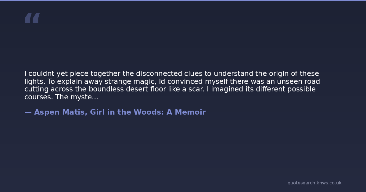 I couldnt yet piece together the disconnected clues to understand the origin of these lights. To explain away strange magic, Id convinced myself there was an unseen road cutting across the boundless desert floor like a scar. I imagined its different possible courses. The mystery intrigued me. I couldnt think of the real destination this road would have been built to lead to, but I accepted I couldnt see, and I accepted it was there, strange but from where I stood a beautiful vision.