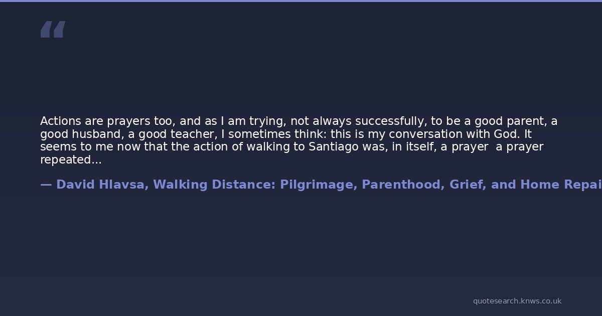 Actions are prayers too, and as I am trying, not always successfully, to be a good parent, a good husband, a good teacher, I sometimes think: this is my conversation with God. It seems to me now that the action of walking to Santiago was, in itself, a prayer a prayer repeatedly and resoundingly answered. Benjamin is an answered prayer, of course, but so was James. He just wasnt the answer we expected.