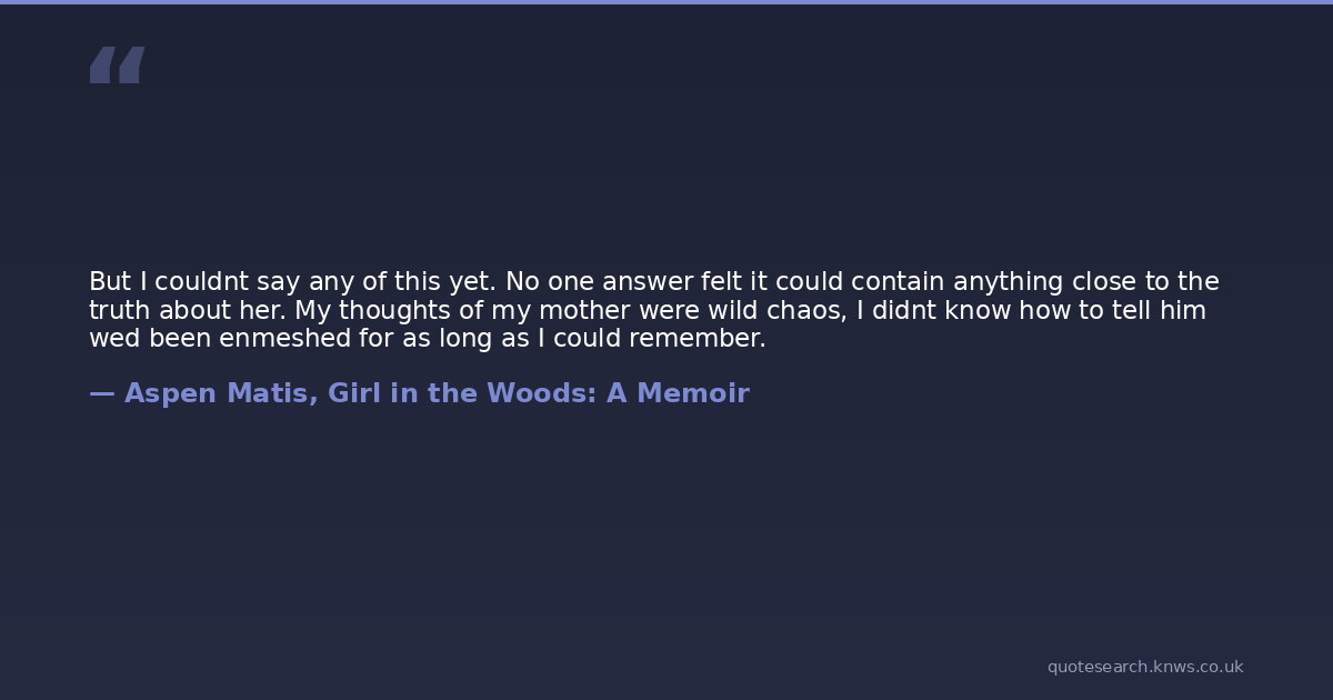 But I couldnt say any of this yet. No one answer felt it could contain anything close to the truth about her. My thoughts of my mother were wild chaos, I didnt know how to tell him wed been enmeshed for as long as I could remember.