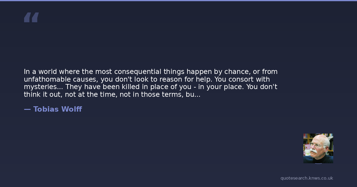 In a world where the most consequential things happen by chance, or from unfathomable causes, you don't look to reason for help. You consort with mysteries... They have been killed in place of you - in your place. You don't think it out, not at the time, not in those terms, but you can't help but feel it, and go on feeling it. It's the close call you have to keep escaping from, the unending doubt that you have a right to your own life. It's the corruption suffered by everyone who lives on, that henceforth they must wonder at the reason and probe its justice.