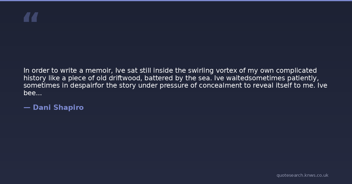 In order to write a memoir, Ive sat still inside the swirling vortex of my own complicated history like a piece of old driftwood, battered by the sea. Ive waitedsometimes patiently, sometimes in despairfor the story under pressure of concealment to reveal itself to me. Ive been doing this work long enough to know that our feelingsthat vast range of fear, joy, grief, sorrow, rage, you name itare incoherent in the immediacy of the moment. It is only with distance that we are able to turn our powers of observation on ourselves, thus fashioning stories in which we are characters