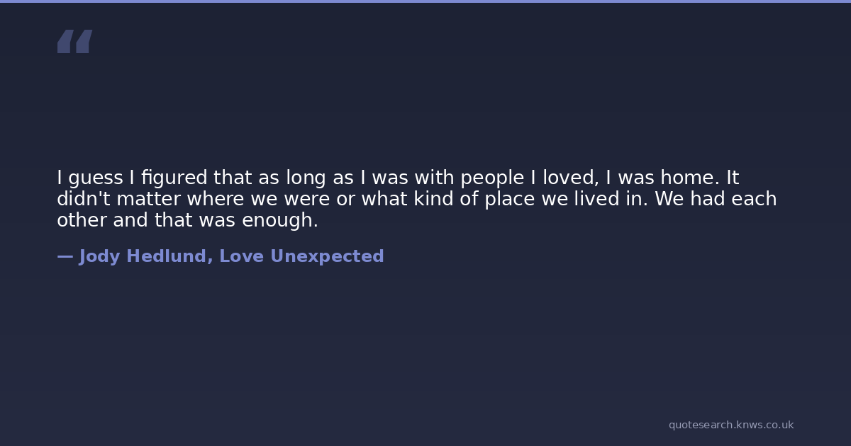 I guess I figured that as long as I was with people I loved, I was home. It didn't matter where we were or what kind of place we lived in. We had each other and that was enough.