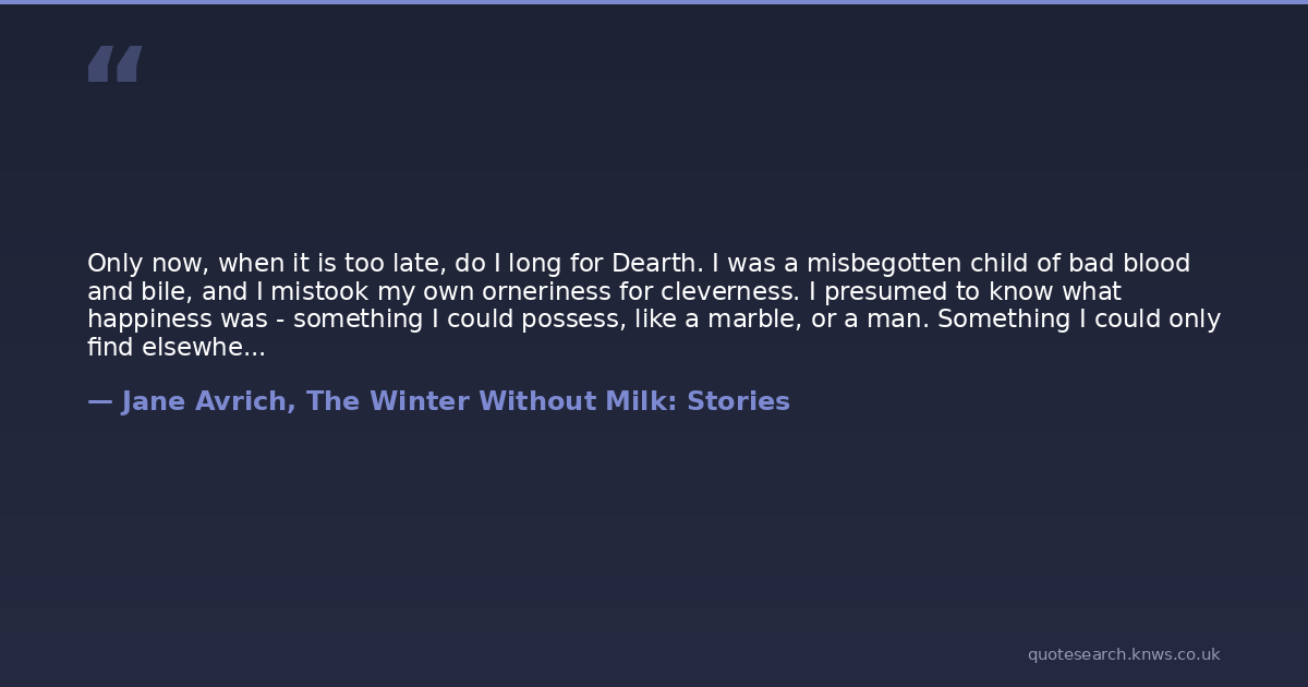 Only now, when it is too late, do I long for Dearth. I was a misbegotten child of bad blood and bile, and I mistook my own orneriness for cleverness. I presumed to know what happiness was - something I could possess, like a marble, or a man. Something I could only find elsewhere. But just when I started to find it at home, I outfoxed myself and lost it forever.