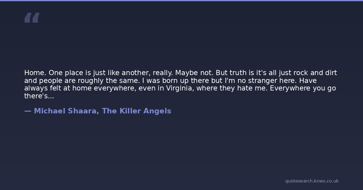 Home. One place is just like another, really. Maybe not. But truth is it's all just rock and dirt and people are roughly the same. I was born up there but I'm no stranger here. Have always felt at home everywhere, even in Virginia, where they hate me. Everywhere you go there's nothing but the same rock and dirt and houses and people and deer and birds. They give it all names, but I'm at home everywhere. Odd thing: unpatriotic. I was at home in England. I would be at home in the desert. In Afghanistan or far Typee. All mine, it all belongs to me. My world.
