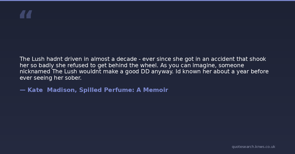 The Lush hadnt driven in almost a decade - ever since she got in an accident that shook her so badly she refused to get behind the wheel. As you can imagine, someone nicknamed The Lush wouldnt make a good DD anyway. Id known her about a year before ever seeing her sober.