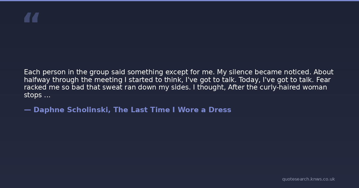 Each person in the group said something except for me. My silence became noticed. About halfway through the meeting I started to think, I've got to talk. Today, I've got to talk. Fear racked me so bad that sweat ran down my sides. I thought, After the curly-haired woman stops talking I'll raise my hand. A man with a cocky smile told the curly woman that her story was nothing compared to his, he'd been passed out cold from heroin and God knows what, and I wanted to tell him to quit glorifying hinself. I was just about to say the words, a few faces turned toward me as if they could sense my imminent speech, when a man across the circle interrupted.The opportunity passed; what I wanted to say wouldn't fit now. I tilted on the back two legs of the chair and waited for my desire to speak and be noticed and be part of the group to travel back through my nervous system. Up the synapses condemnation rushed: Why couldn't I spit something out like a normal person?