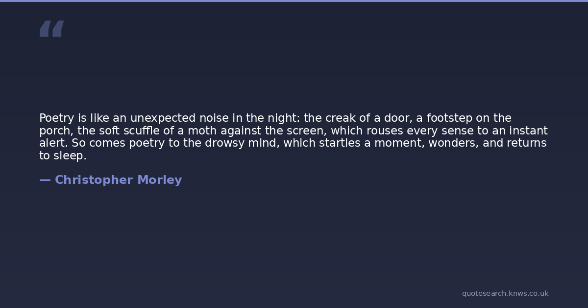 Poetry is like an unexpected noise in the night: the creak of a door, a footstep on the porch, the soft scuffle of a moth against the screen, which rouses every sense to an instant alert. So comes poetry to the drowsy mind, which startles a moment, wonders, and returns to sleep.