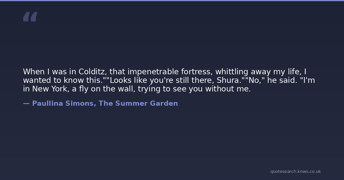 When I was in Colditz, that impenetrable fortress, whittling away my life, I wanted to know this.""Looks like you're still there, Shura.""No," he said. "I'm in New York, a fly on the wall, trying to see you without me.