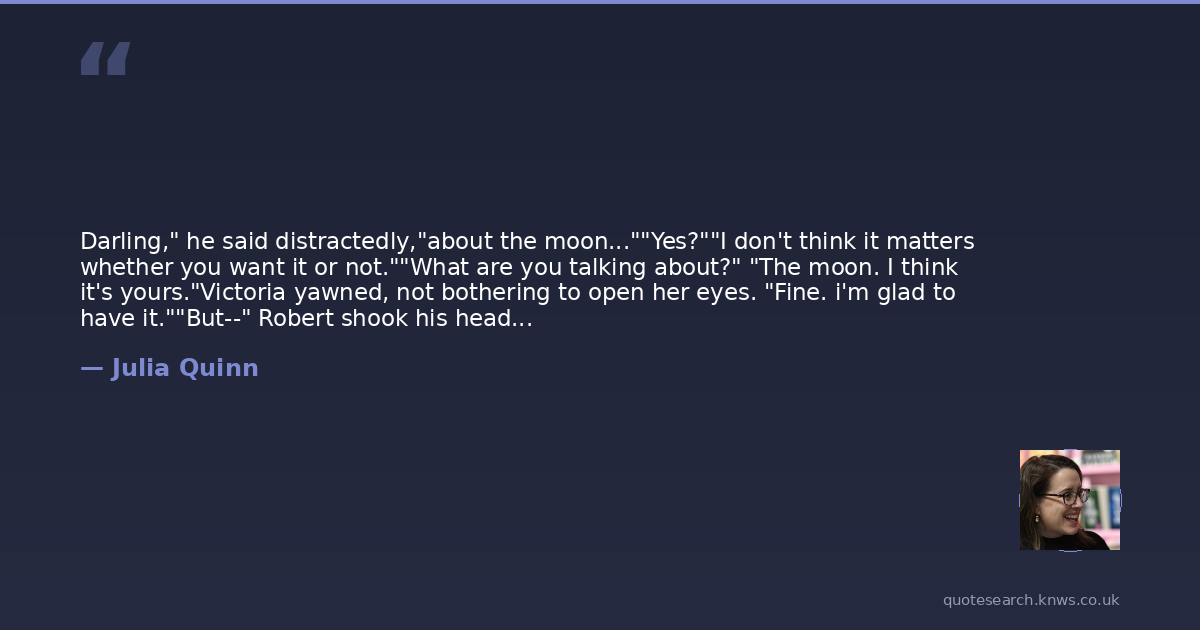 Darling," he said distractedly,"about the moon...""Yes?""I don't think it matters whether you want it or not.""What are you talking about?" "The moon. I think it's yours."Victoria yawned, not bothering to open her eyes. "Fine. i'm glad to have it.""But--" Robert shook his head. He was growing fanciful. the moon didn't belong to his wife. It didn't follow her, protect her. It certainly didn't wink at anybody.But he stared out the window the rest of the way home, just in case